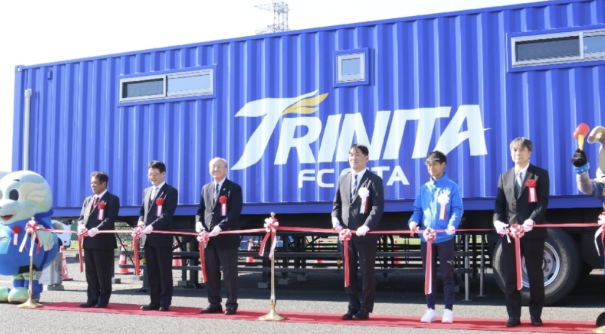 サッカーJ2の大分トリニータを運営する大分フットボールクラブ(FC)は、大分市松岡のクラブハウス横にクラウドファンディング(CF)を通じてトレーラーハウスを設置した。26日、現地で除幕式があった。