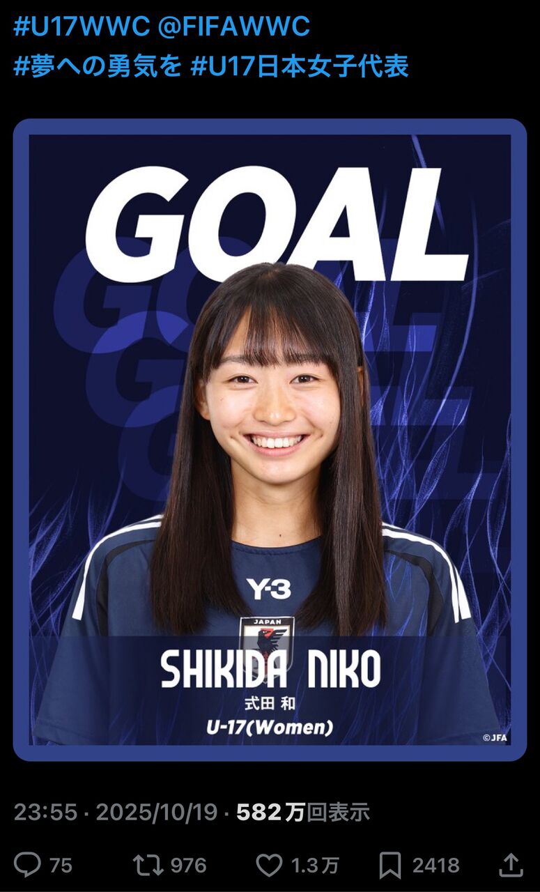 リトルなでしこがU-17女子W杯で連勝し、1次リーグ突破。元Jリーガー・式田親父を持つ式田和選手が注目され、SNSでも「かわいい」「スター候補」と話題に。ゴールセンスと笑顔が高評価で、動画は580万回以上再生されるなど人気急上昇。試合内容にも触れられ、チーム全体の完成度や他選手の活躍にも言及が。父親の経歴や兄の存在からも、サッカー一家としての期待が高まっている。今後の成長が楽しみな選手だ。